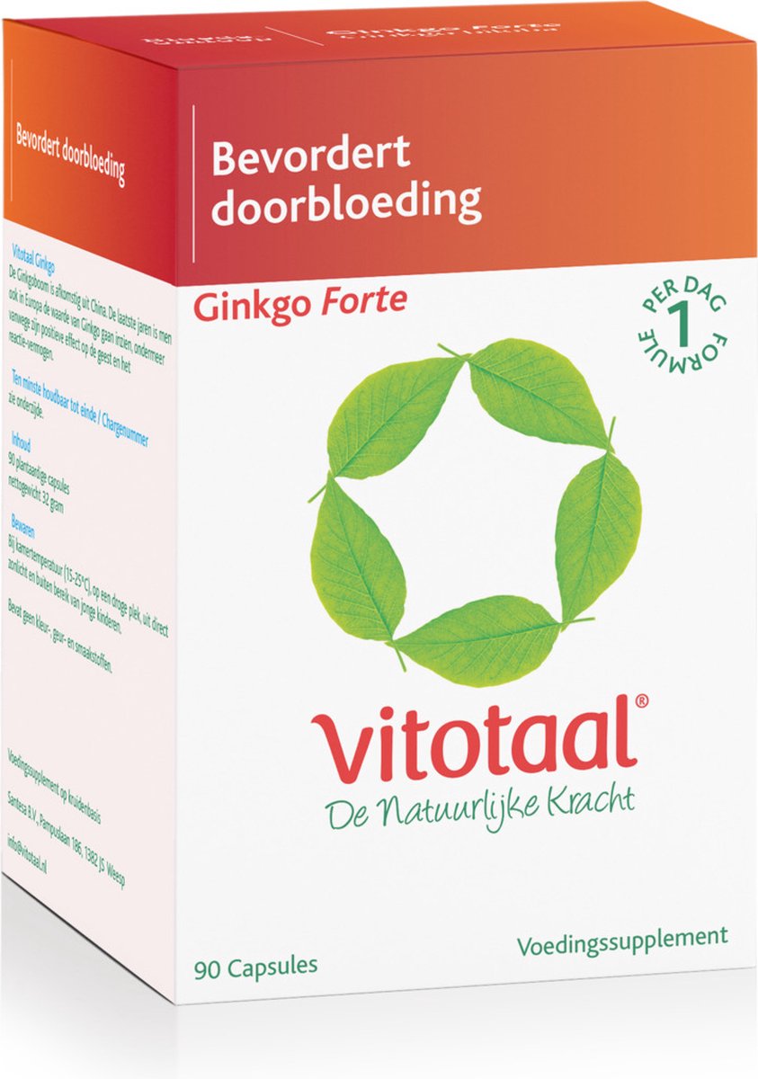 Vitotaal Ginkgo forte – Kruidenpreparaat. Ginkgo Forte komt van de Ginkgoboom, afkomstig uit China. Bevordert de doorbloeding en heeft positief effect op het reactie-vermogen en de geest.